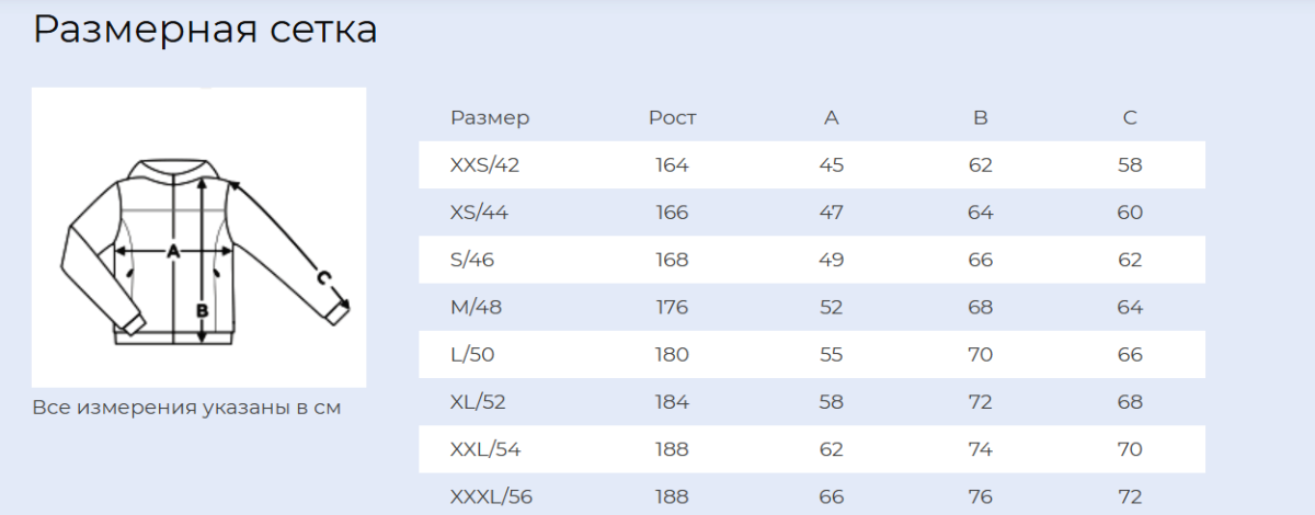 | Размер | XXS/42, XS/44, S/46, M/48, L/50, XL/52, XXL/54, XXXL/56 |