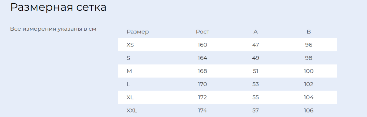 | Размер | XS/44, S/46, M/48, L/50, XL/52, XXL/54, XXXL/56 |